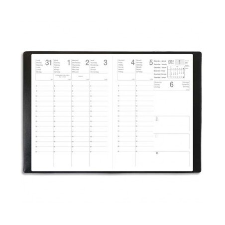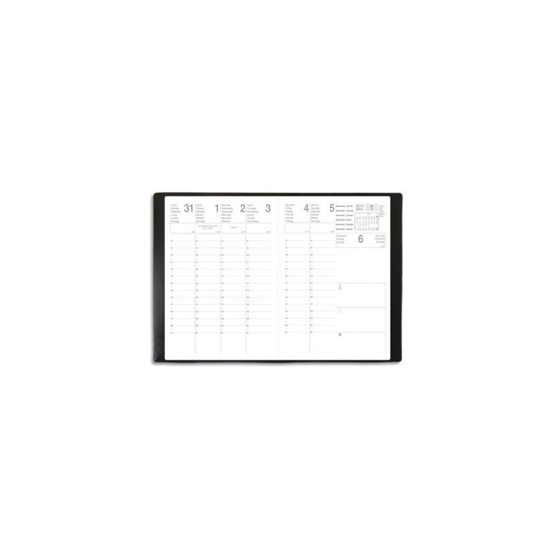Semainier économique 1 semaine sur 2 pages et un espace pour écrire des notes. Couverture en PVC lisse de couleur noir. Semainier de bureau.