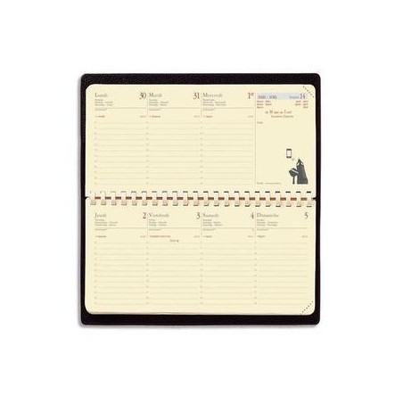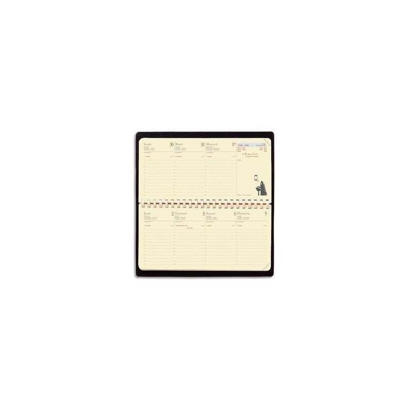 Format 8,8 x 17 cm à l’italienne. 1 semaine sur 2 pages papier ivoire. Couverture plastique grainée noire. Planital.