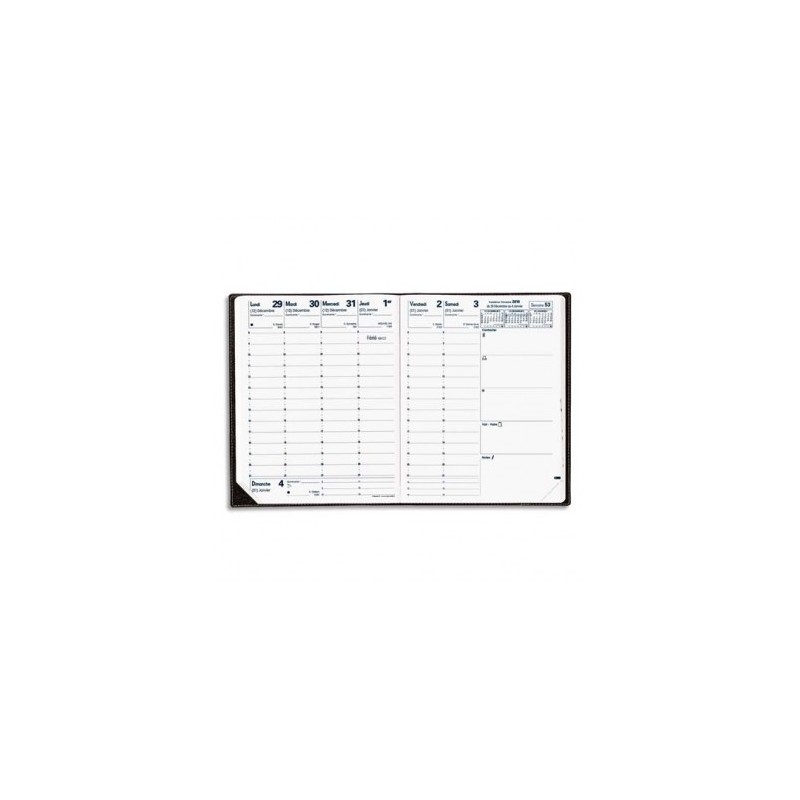 1 semaine sur 2 pages. Décembre à décembre : 13 mois. Couverture plastique grainée noire. Ministre.