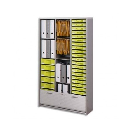 Panneaux de particules surfacé mélaminé haute résistance revêtu de chants assortis, densité 700 kg/m3 contrebalancé, norme E1, certificat de qualité P4 décerné par le FCBA (Centre Technique du Bois et de l’Ameublement), résistance au feu : M3. 3 colonnes, fermeture par rideaux munis d’une serrure, 2 clés fournies dont 1 rabattable. Equipée de 20 tiroirs H 5 cm, 6 tiroirs H 10 cm, 2 niveaux pour dossiers suspendus, 4 cases avec tablettes. Armoire haute Multiclass.