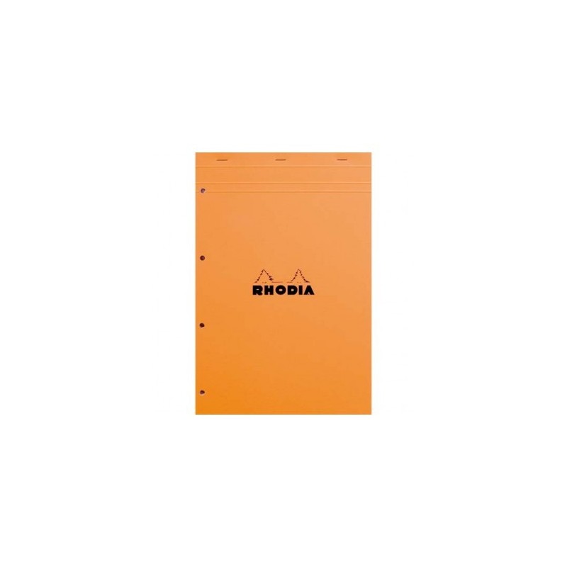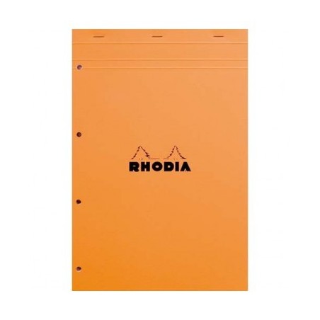 Couverture enduite orange. Format 21 x 31,8 cm (A4+). Dos rigide cartonné. 160 pages (80 feuilles) perforées 4 trous (80 mm) détachables par micro perforation. Papier certifié PEFC, vélin surfin 80 g blanc. RHODIA Bloc de direction