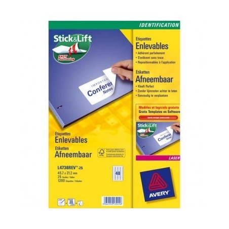 Compatibles avec toutes imprimantes laser. Adhérent parfaitement et se retirent facilement, sans trace de colle, ni résidus. Idéales pour l’identification flexible ou provisoire d’un produit, dos de classeur, rayonnage... Modèles et logiciels gratuit sur www.avery.fr Facile à enlever, sans trace !