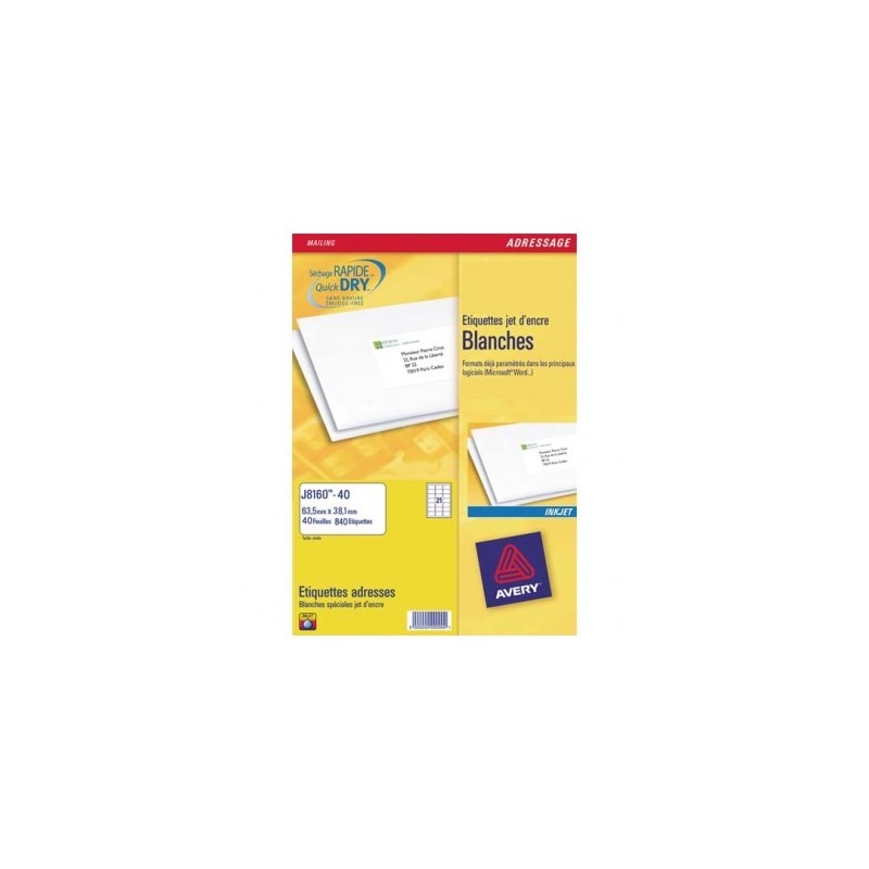 Facile et rapide : le format des étiquettes Avery est paramétré dans tous les principaux logiciels. Garanties dans toutes les imprimantes jet d’encre. Étiquettes adhésives blanches.