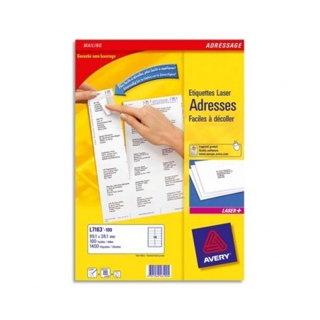 Garanties sans bourrage et compatibles toutes imprimantes laser. Faciles à décoller de la planche et rapides à appliquer grâce à la technologie "Facile à décoller". Ces étiquettes sont recyclables avec un adhésif à base d’eau et un emballage recyclé. Modèles et logiciels gratuits sur www.avery.fr. Étiquettes adhésives blanches.