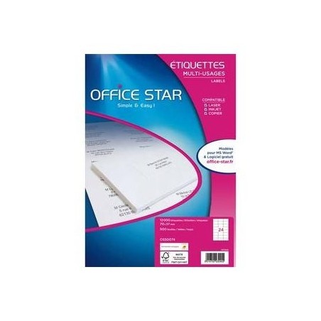 OFFICE STAR Boîte de 12000 étiquettes multi-usages. Dimensions : 70 x 37 mm. Réf OS50074