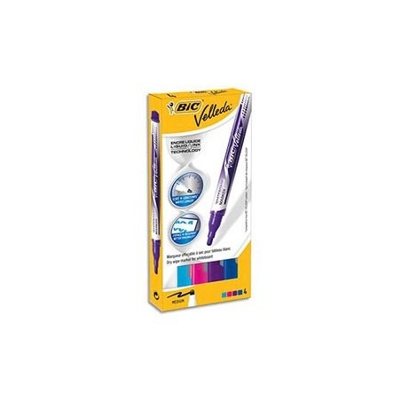 BIC Pochette 4 feutres Velleda Liquid Ink ogive 4,5 mm. Couleur : Violet, Bleu foncé, Bleu Turquoise, Rose