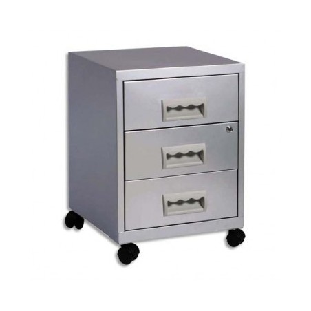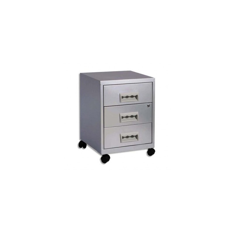 Fabrication monobloc en métal peinture epoxy. Serrure à clé bloquant les tiroirs, 2 clés fournies. Livré avec 4 roulettes pivotantes + kit de montage. 2 clés fournies. Fermeture des tiroirs 2 à 2 (sur le 3 tiroirs, le tiroir du bas reste ouvert). Caisson Budget.