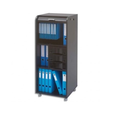 Desserte mobile à rideau à fermeture à clé équipé de 2 tablettes 3 tiroirs et un support pour dossier suspendus. Réalisé en panneau de particule surfacé haute résistance. Dimensions (l x h x p) : 47 x 117 x 47 cm. Dimensions utiles des tiroirs (l x h x p) : 25 x 10 x 37 cm. Dimensions intérieures de la desserte : (l x h x p) : 44 x 96 x 39 cm. Le rangement polyvalent.