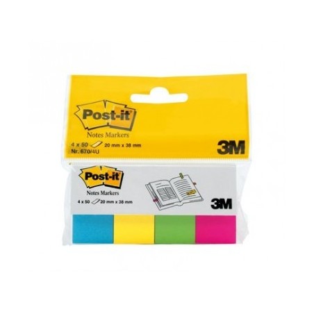 Etui de 4 blocs de 50 feuilles. Format 20 x 38 mm. Coloris assortis : vert, jaune, bleu, rose. Marque-pages papier !