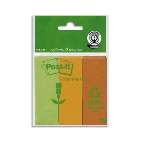 POST-IT 3 blocs index recyclé 100 feuilles 25 x 76 mm assortis classiques