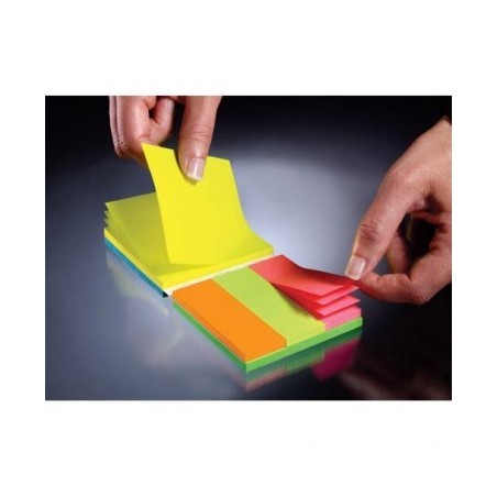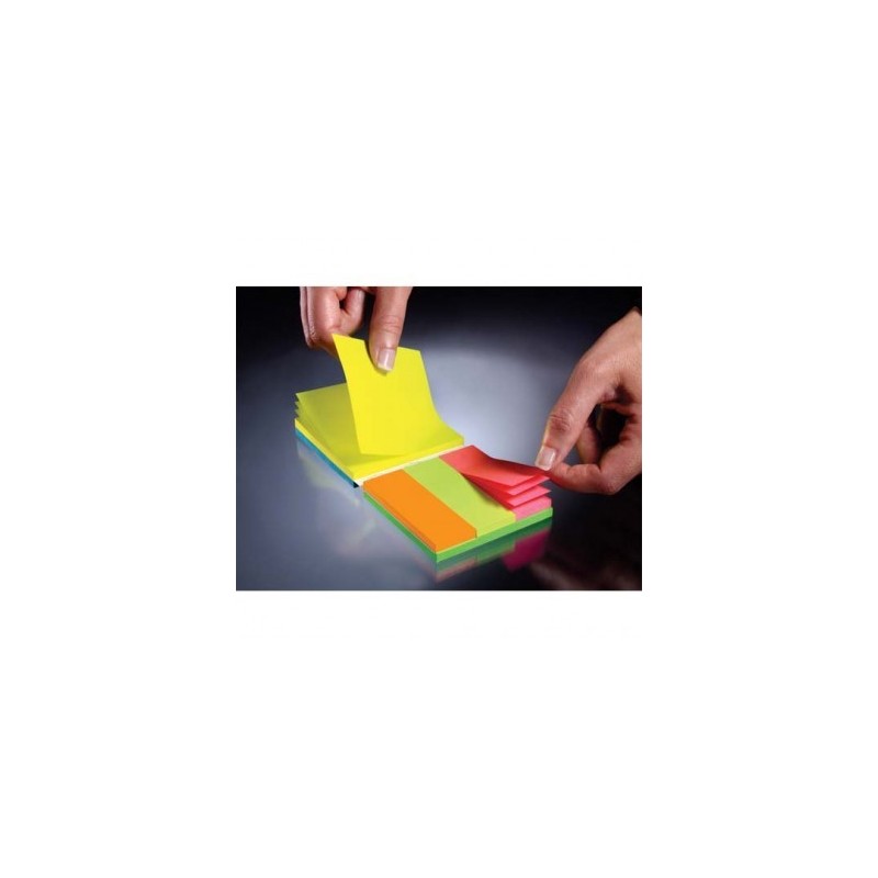 Un outil d'organisation et de classement compact et efficace. Plusieurs couleurs et formats sur le même bloc. Ensemble de 3 blocs de 50 feuilles format 7,6 x 7,6 cm bleu ultra, jaune néon, vert ultra et 1 bloc de 50 feuilles format Note Markers 7,6 x 2,5 cm. 4 produits en 1.