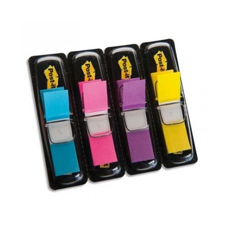 Set de 4 x 35 marque-pages étroits 1,2 x 4,4 cm. Se recharge également dans les distributeurs. Assortis coloris vifs : jaune, violet, rose, bleu. Marque-pages format étroit