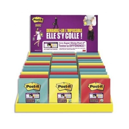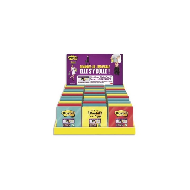 Présentoir classique contenant 48 notes Super Sticky de 90 feuilles 76 x 76 mm. 12 blocs de couleur : jaune jonquille, rouge coquelicot, bleu océan et bleu électrique. Présentoir de notes.