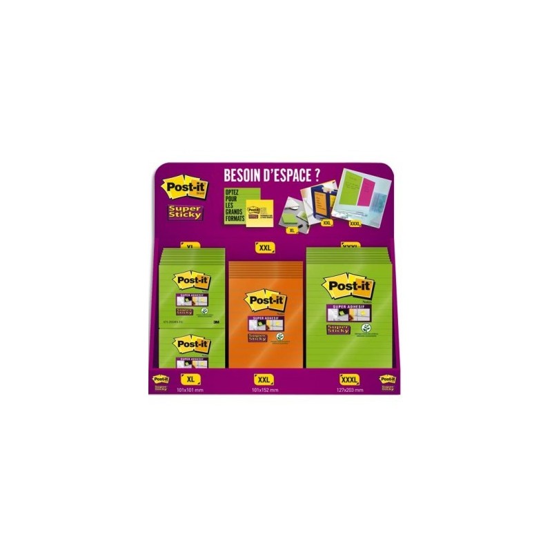 Présentoir contenant 36 notes lignées Super Sticky grand format. 12 lots de 3 blocs de 70 feuilles Notes Super Sticky 101 x 101 mm. Coloris vert, fuchsia, bleu. 12 lots de 3 blocs de 45 feuilles Notes Super Sticky 101 x 152 mm. Coloris orange, bleu, vert. 12 lots de 2 blocs de 70 feuilles Notes Super Sticky 127 x 203 mm. Coloris vert, fuchsia. Présentoir de notes.