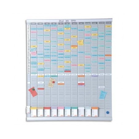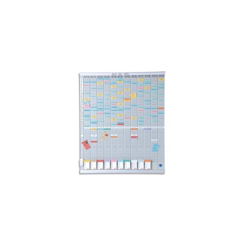 Recommandé pour les auto-écoles, les sociétés de location, les mairies, etc... Ce kit comprend : 12 bandes 54 fentes indice 2 + 1 bande index 54 fentes indice 1, 2 supports en aluminium avec bandes titres vierges, 10 étuis de 100 fiches T indice 2 (coloris assortis), 1 étui de 100 fiches indice 1 (blanc), étiquettes imprimées "janvier" à "décembre" et 12 porte-étiquettes magnétiques. Kit de fixation murale. Dimensions : H 96 x L 80 cm. Pour visualiser toute l’année ou 12 colonnes d’un seul coup d’oeil !