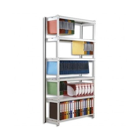 Système prêt à monter sans vis ni boulons. Montage facile par simple emboîtement. Montants en acier 15/10ème époxy gris. Cadre acier 8/10 époxy gris. Possibilité d’ajouter à droite ou à gauche un ou plusieurs éléments de mêmes dimensions. Utilisation 5 niveaux intervalles pour dossiers suspendus ou 4 niveaux pour dossiers suspendus et 1 niveau pour boîtes archives. Tablettes en option. Comprend 8 montants, 1 barre transversale, 12 traverses de 37 cm et 12 traverses de 100 cm. Spécial dossiers suspendus.
