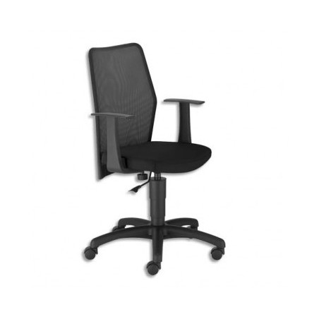 Assise tissu non feu 100 % polyester. Mousse 35 kg/m2. Dossier règlable en profondeur tendu de résille noir non feu. Piètement 5 branches nylon. Dimensions assise (l x p) 46 x 45 cm. Dossier hauteur 45 x 45 cm. (Accoudoirs fournis). Le petit looké.