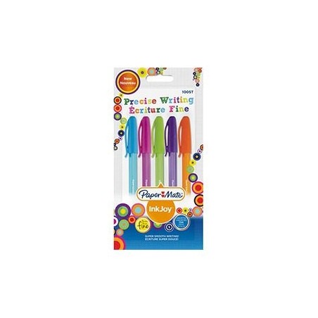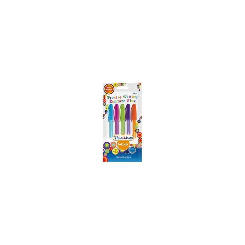 PAPERMATE Inkjoy Stylo bille capuchon. Pointe fine. Blister de 5: magenta, violet, turquoise, vert pomme, orange.