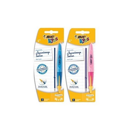 Butée pour un positionnement des doigts idéal. Idéal pour Gaucher ou Droitier. Pointe large (Ø 1mm). Encre bleue. Les blisters sont assortis (corps bleu et rose). Les stylos bille d'apprentissage
